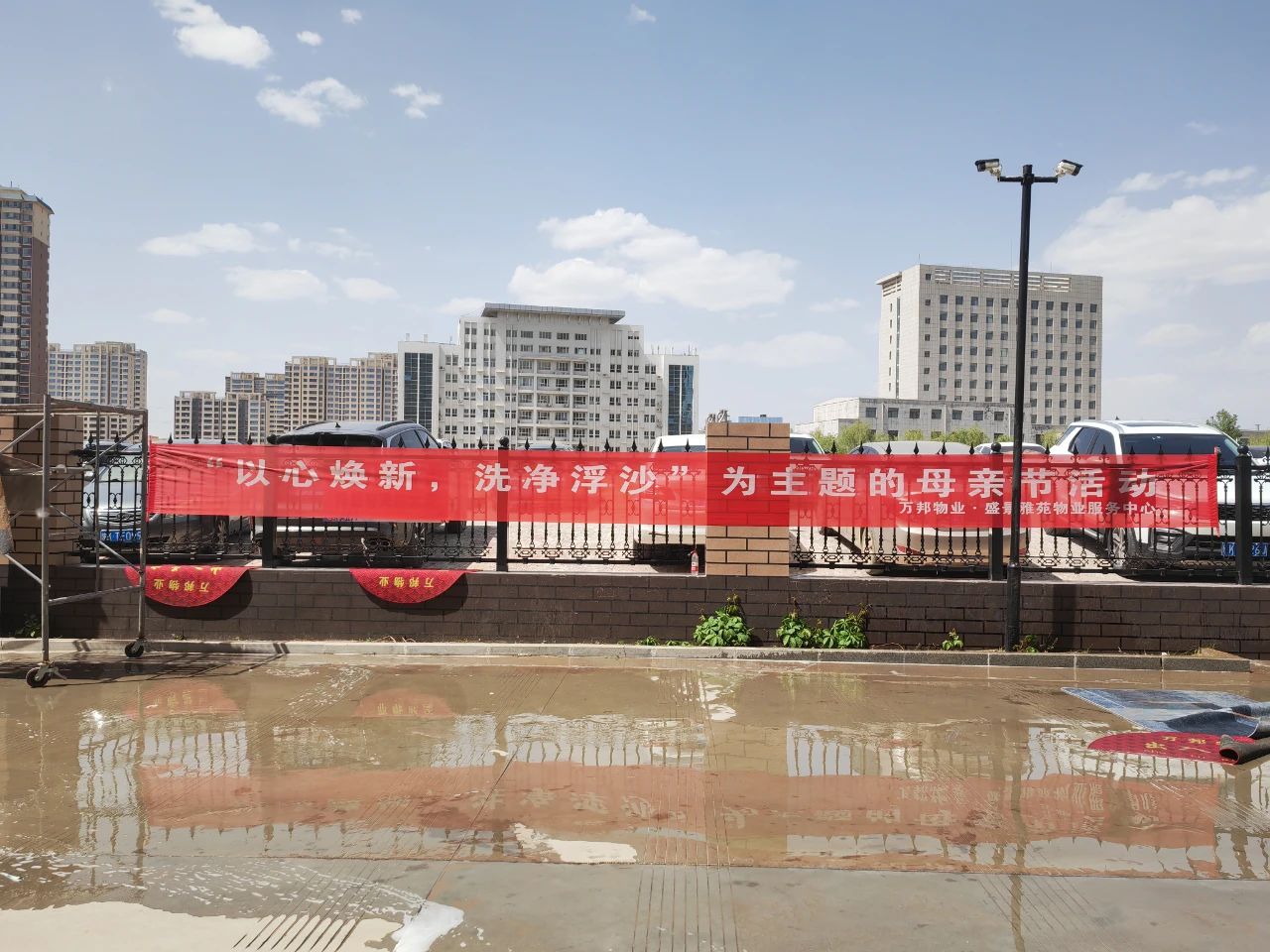 2023年5月14日借母親節(jié)之日,萬邦物業(yè)·盛景雅苑物業(yè)服務(wù)中心在小區(qū)4號樓北側(cè)開展“以心煥新,洗凈浮沙”為主題的母親節(jié)活動——解放媽媽的雙手, 免費(fèi)為小區(qū)業(yè)主家人們清洗地墊。