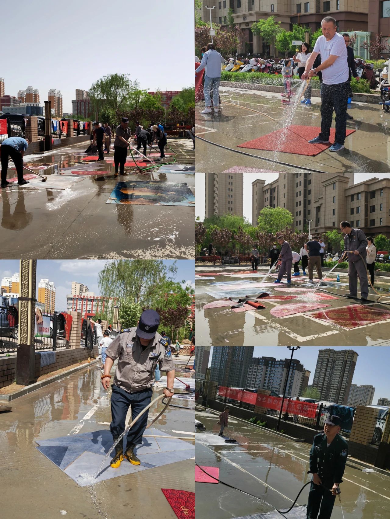 活動當(dāng)天,天氣晴好,盛景雅苑物業(yè)服務(wù)中心的客服人員、保潔人員、工程人員和保安人員齊齊上陣,橫幅一掛,熱情高漲。大家把早早準(zhǔn)備好的刷子、清潔劑、洗衣粉、高壓水槍都快速的帶到活動現(xiàn)場,一眨眼的功夫,小區(qū)的“業(yè)主家人們”也陸續(xù)將自家的地墊拿到活動現(xiàn)場,一一鋪開,物業(yè)人員用高壓水槍等清洗工具熟練地對“業(yè)主家人們”的地墊進(jìn)行清洗起來。通過物業(yè)工作人員的洗、刷、沖、晾、曬等環(huán)節(jié),將原本帶有泥漬的地墊變得煥然一新。