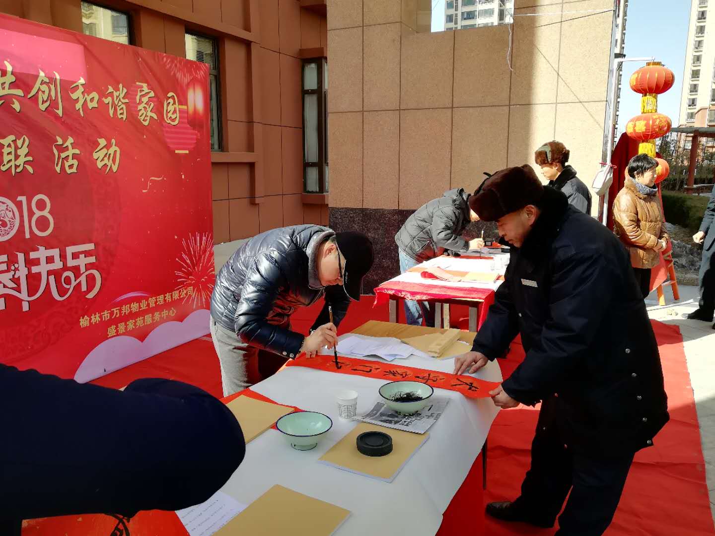 公司為喜迎新春,營(yíng)造歡樂(lè)和諧的春節(jié)節(jié)日氛圍,同時(shí)增進(jìn)業(yè)主的鄰里關(guān)系,進(jìn)一步弘揚(yáng)傳統(tǒng)文化,榆林市萬(wàn)邦物業(yè)管理有限公司于2018年2月8日舉辦了盛景家苑小區(qū)“迎新春·攜手共創(chuàng)和諧家園”義寫(xiě)春聯(lián)活動(dòng)。