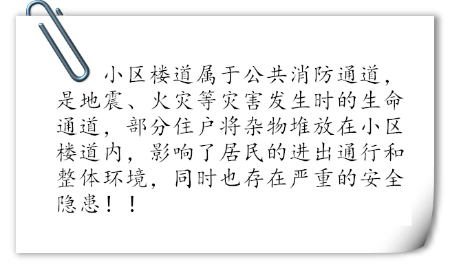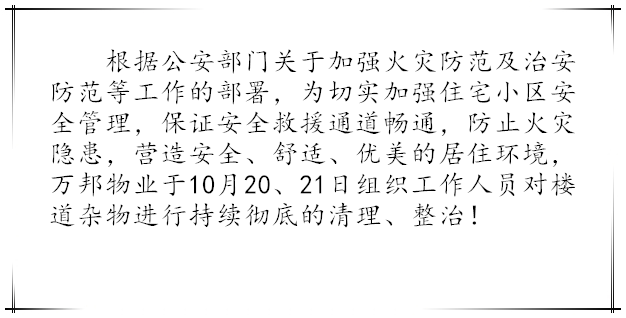 根據(jù)公安部門關(guān)于加強火災(zāi)防范及治安防范等工作的部署,為給業(yè)主創(chuàng)造一個優(yōu)美、舒適、安全的居住環(huán)境。我物業(yè)公司一直堅持不懈的做著此工作,本月針對長期占用公共區(qū)域堆放雜物的業(yè)戶進行統(tǒng)一上門清理,并向業(yè)主傳達相關(guān)消防法律知識。